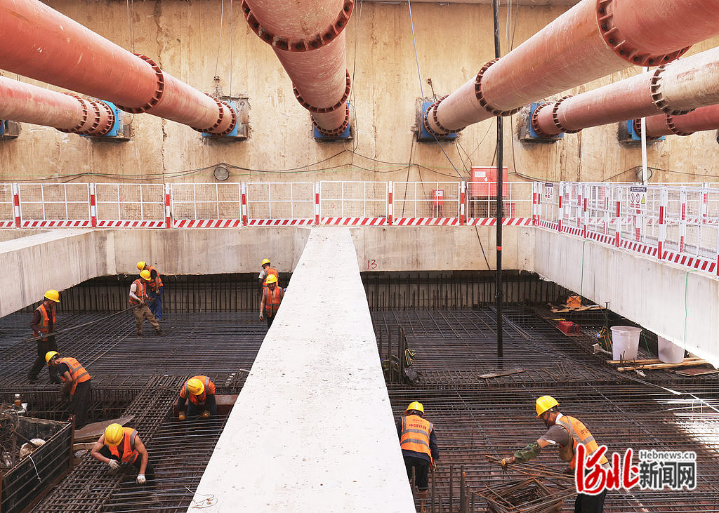 8月22日,工人在石家庄地铁5号线解放大街站现场施工作业。