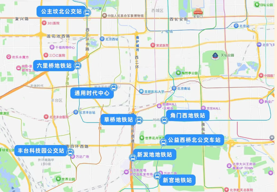 其中,北京端覆盖9个重要交通枢纽点位,包括丽泽商务区、新宫地铁站、新发地地铁站、公益西桥北公交车站、角门西地铁站、草桥地铁站、丰台科技园地铁站、六里桥地铁站、公主坟地铁站。