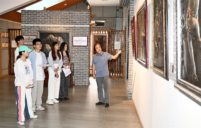 8月20日,中国工艺美术大师、“郭氏铁板浮雕”传承人郭海博(右一)在为大学生们讲解铁板浮雕作品。