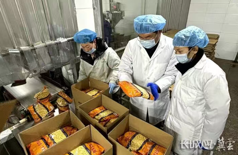 在乐亭县金田果菜有限公司,随着机器轰鸣,已经加工好的玉米粒、豌豆粒等正顺着传送带运送至包装环节。在这里,李瑶仔细观察着每一个细节并不时询问着。