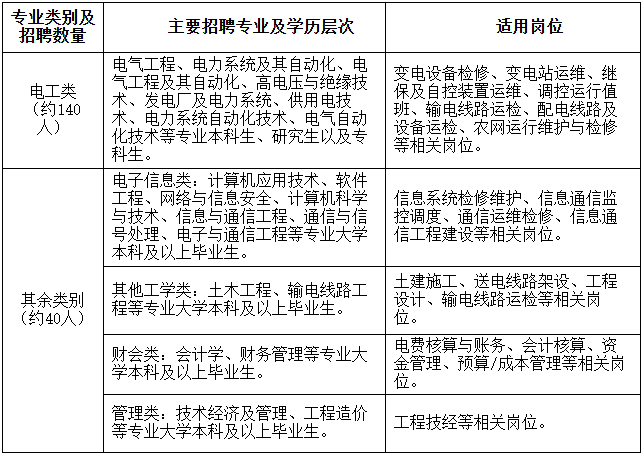招聘专业指主修专业(不包含辅修专业)。招聘专业主要为电工类专业,少量招聘非电工类专业。根据2026年第一批招聘毕业生流失情况,进行少量补招。最终招聘数量将根据上级单位核定情况相应调整,主要招聘计划如下: