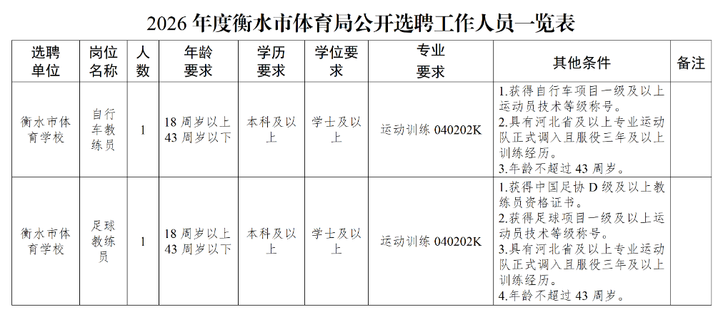 衡水市体育学校拟选聘专业技术岗位人员2名。