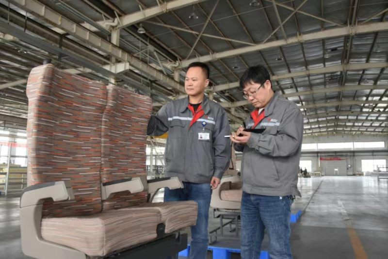 2025年10月10日,唐山华达轨道交通装备有限责任公司的技术人员测试座椅。新华社发