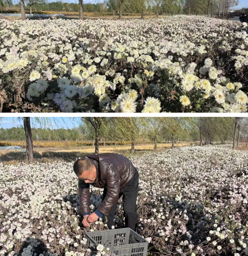 菊花种植有了规模,也有了名气,不仅壮大了乡村经济,更让不少当地村民实现了“家门口”就业。村民赵书箱一上午穿梭在菊花丛中,弯腰俯身忙着采收,不一会就装满一筐。