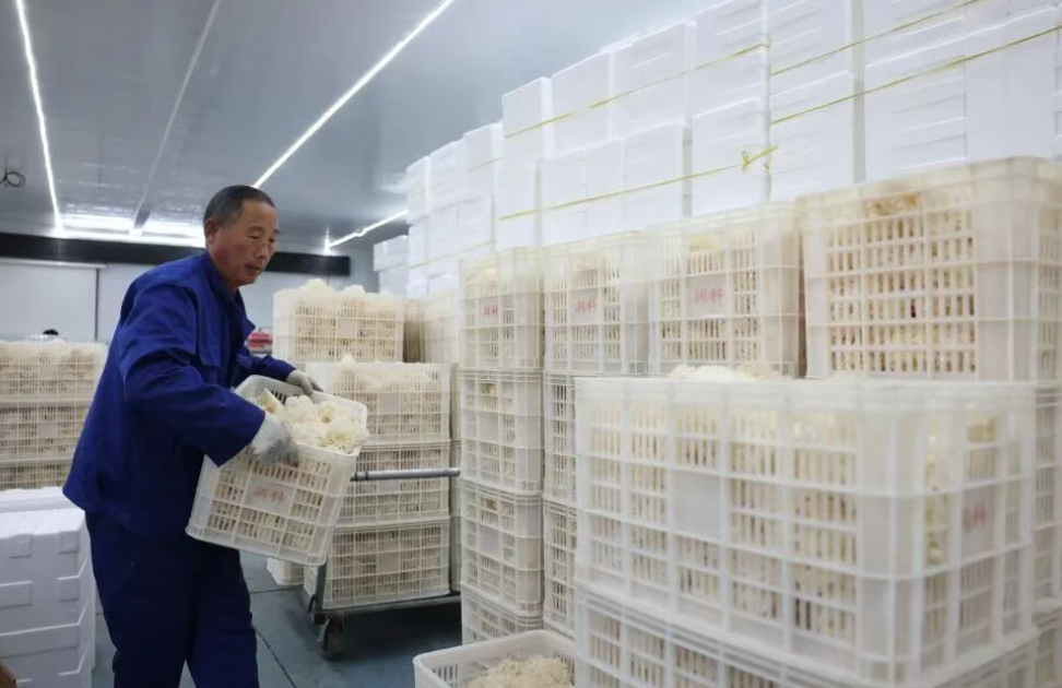 村民搬运采收后等待打包的绣球菌。新华社发(李世强 摄)不仅种得好,更要卖得好。为了拓展销路,新河县与北京新发地集团达成战略合作,开通了“北京新发地—新河县”绿色农产品物流专线,并积极构建线上营销网络,让更多的消费者吃上来自新河的珍稀食用菌。
