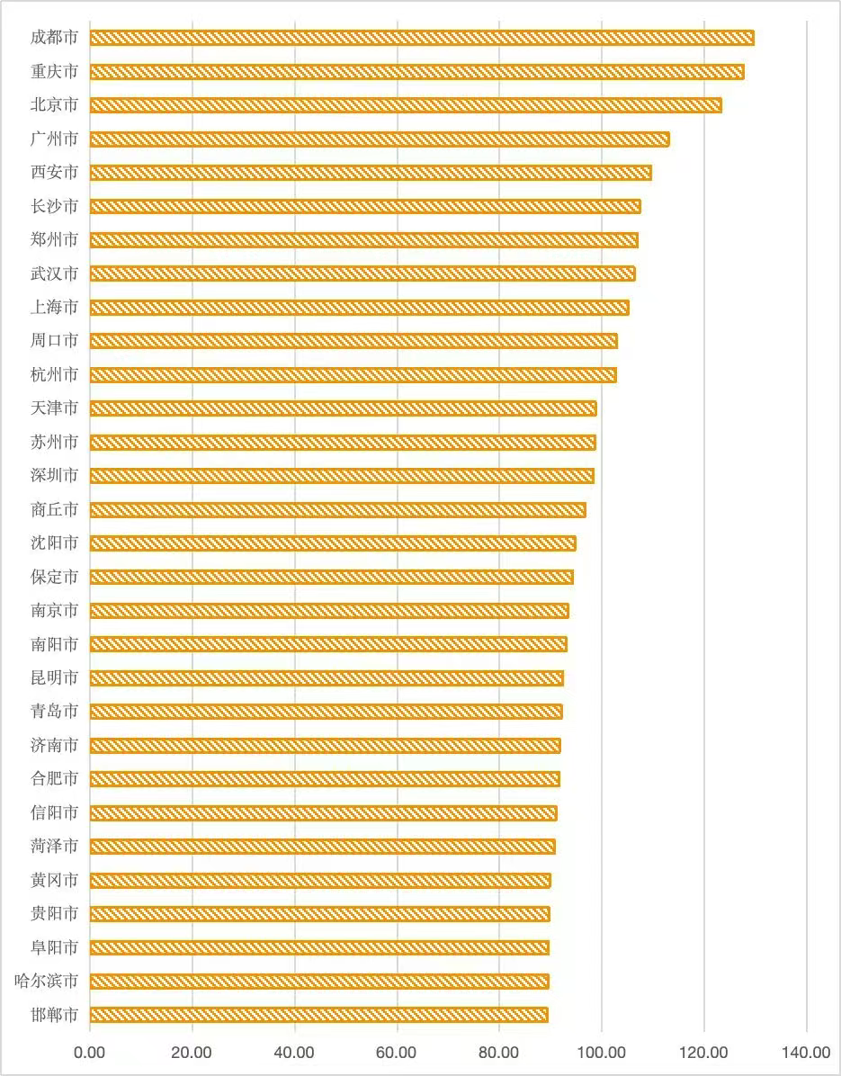 国庆中秋假期城市外地深度游客量TOP30。来源于联通大数据