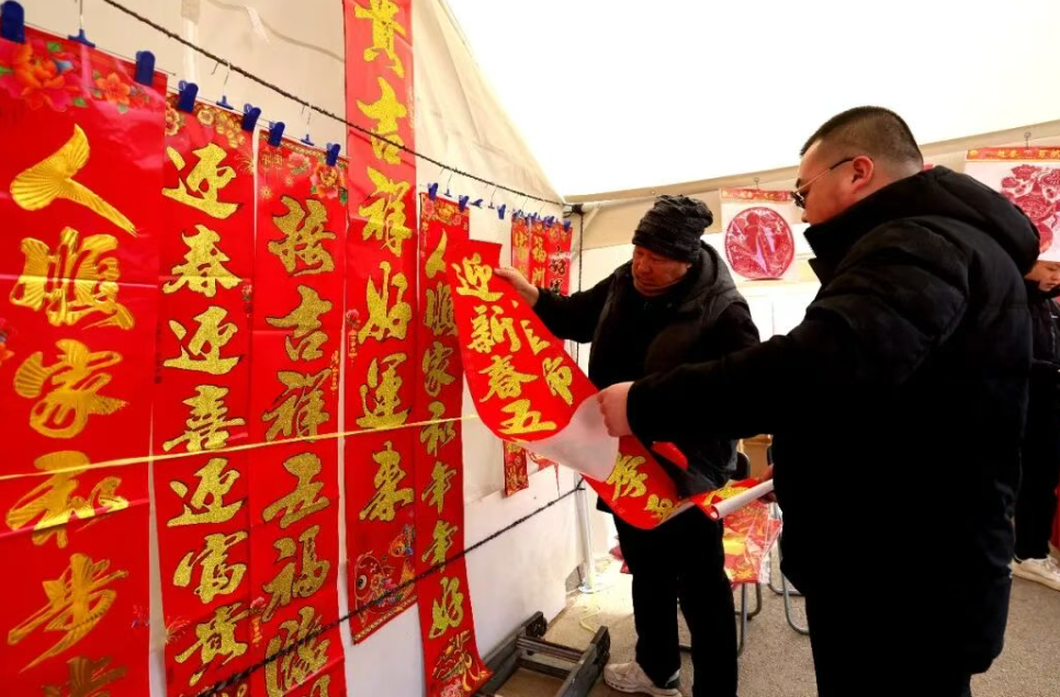 近日,河北省涿州市新春集市热闹非凡,市民们赶大集、办年货,迎接新春佳节。图为2月6日,市民在集市上选购春联。新华社记者 卢烨 摄